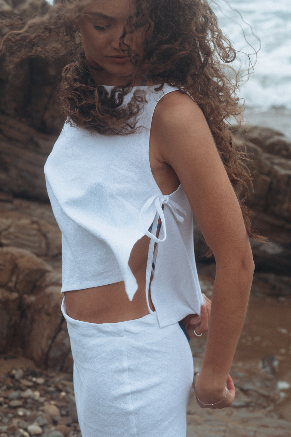 Made from 100% ramie linen. Ramie is made from a nettle plant called 'China Grass' and requires very little water and pesticides to grow. It is absorbent, breathable and holds its shape well, it also softens with washing.
